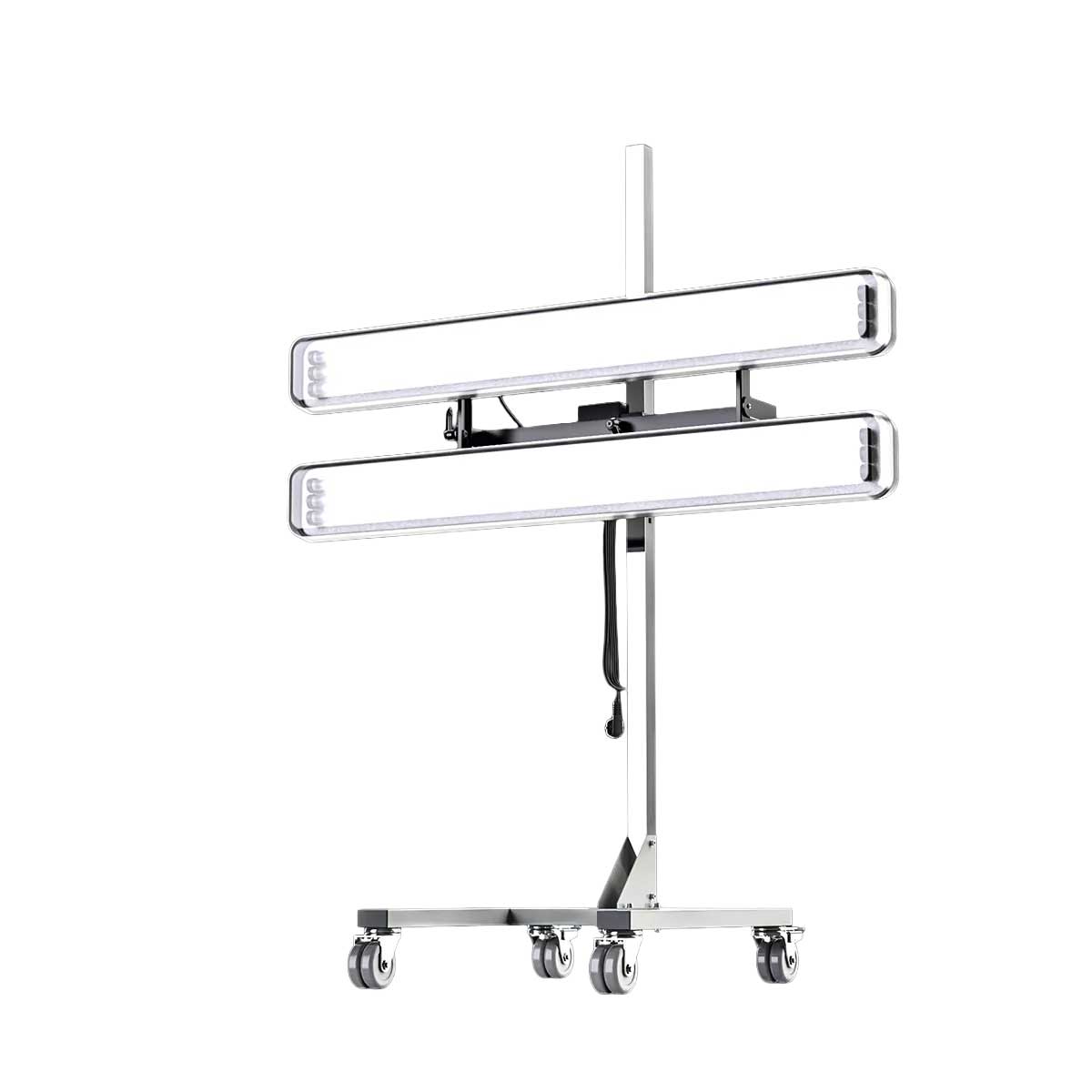 Tageslichtlampe Sunny-01. Die Lampe ist optimal zur Farbtonerkennung geeignet, da sie dank Vollspektrumlicht für optimale Lichtverhältnisse am Objekt sorgt. Beide Lampenfelder sind vertikal und horizontal verstellbar sowie einzeln schwenkbar. Durch ein Zehn-Meter-Stromkabel, ein stabiles Fahrgestell und Doppelrollen, die einfaches Überfahren von Gitterrosten ermöglichen, ist man mit der Sunny Tageslichtlampe besonders flexibel am Arbeitsplatz. Des Weiteren sind die Lampengehäuse stoßfest, was diese Lampe noch besser für den alltäglichen Gebrauch macht.