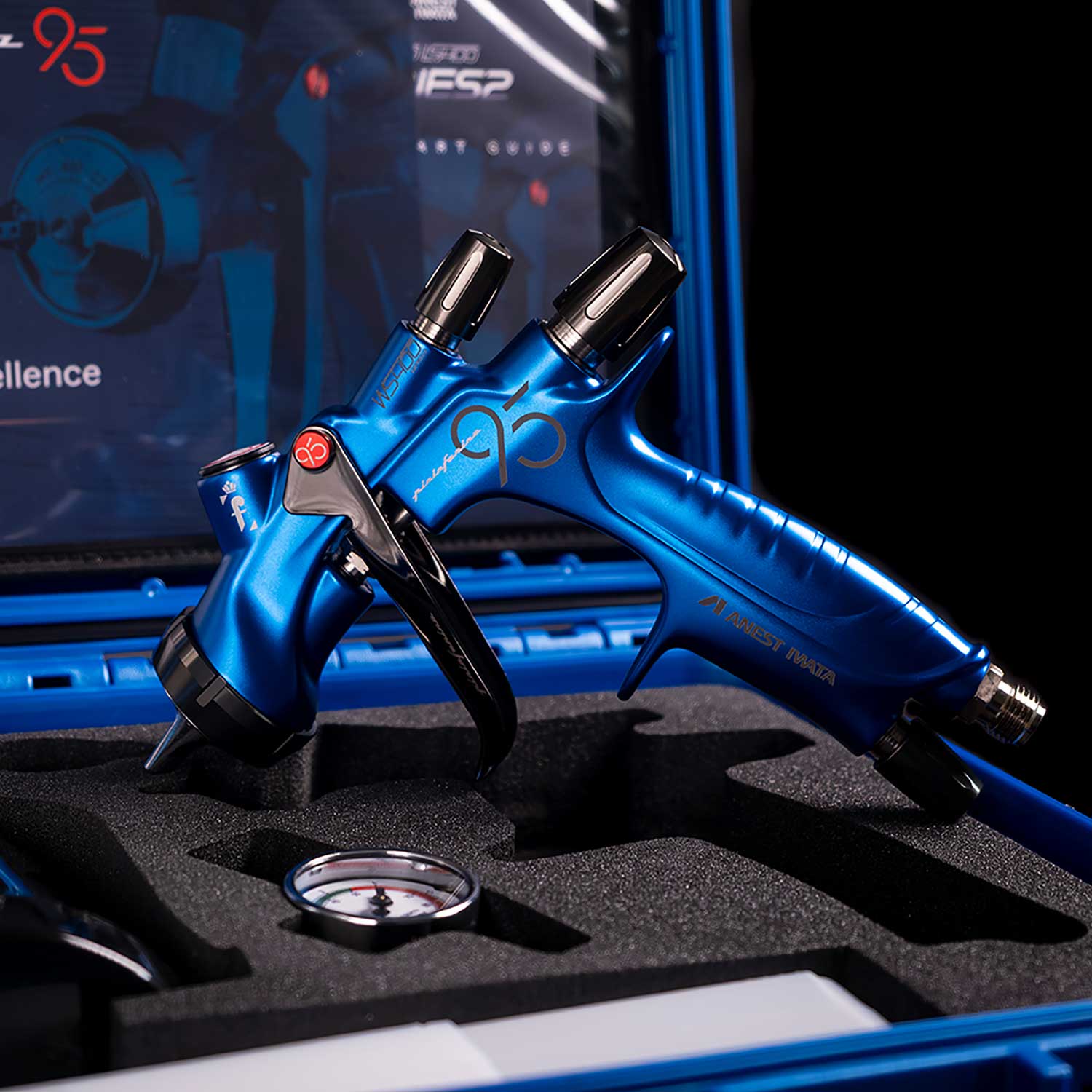 Der ergonomische, dunkelblaue Pistolen-Körper mit roten Akzenten wurde vom Pininfarina-Designchef Nicola Girotti entworfen. Jedes Exemplar ist ein nummeriertes Einzelstück mit lasergraviertem „pininfarina95“-Schriftzug, ein echtes Sammlerobjekt. Technisch überzeugt die WS-400 mit der neuesten Split Nozzle™ 2.0 Zerstäubungstechnologie: Sie erzeugt ein ultrafeines, gleichmäßiges Spritzbild für spiegelglatte Ergebnisse, ganz ohne Orangenhaut. Wartungsarme Bauteile wie die dichtungsfreie Düse, leichtgängige Regler und die optimierte Luftführung sorgen für maximale Kontrolle und ermüdungsfreies Arbeiten.