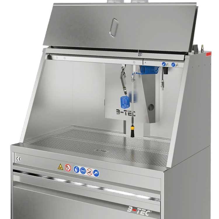 Das B-TEC M-1200-1 Großraumwaschgerät wurde speziell für den intensiven, täglichen Einsatz in industriellen Lackier- und Reparaturbetrieben entwickelt. Mit einer großzügigen Arbeitsbreite von 1200 mm bietet das System ausreichend Platz für große Bauteile und sorgt gleichzeitig für eine ergonomische, komfortable Handhabung. Die integrierte, leistungsstarke Absaugung schützt zuverlässig vor Lösemitteldämpfen und sorgt für sicheres Arbeiten. Mit einem regulierbaren Durchlaufpinseln samt Frischspüldüsen ausgestattet.