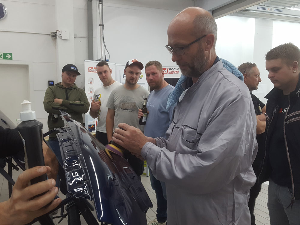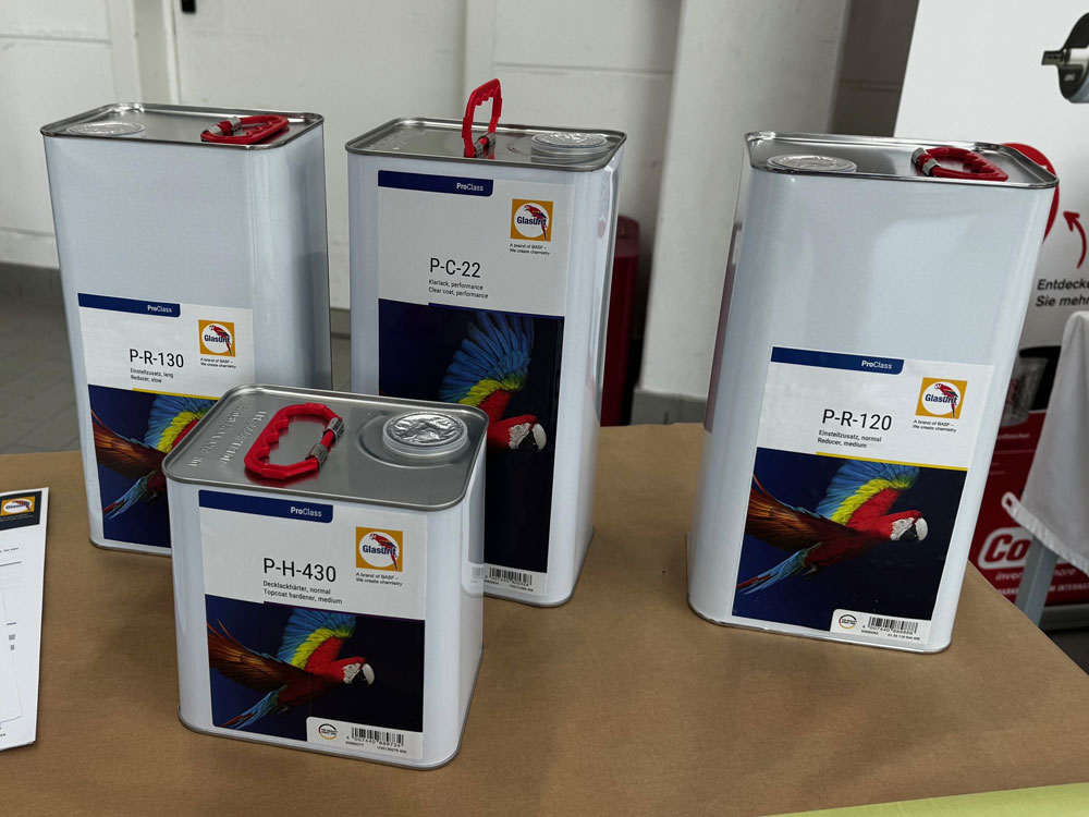 Ein weiteres Highlight des Abends war die Produktvorführung unseres Anwendungstechnikers Dirk Bitterlich. In der Lackierkabine präsentierte er live den neuen, schnelltrocknenden Klarlack von Glasurit aus der ProClass P-C-22. Dieser universell einsetzbare Klarlack überzeugte die anwesenden Lackierer durch seine außergewöhnlich schnelle Trocknung: Bereits nach nur 15 Minuten bei 60°C kann der Lack poliert werden. Damit lässt sich das Lackfinish deutlich schneller und effizienter umsetzen. Ein weiterer Vorteil ist die Möglichkeit der Aushärtung bei nur 40°C, was den P-C-22 besonders attraktiv für die Lackreparatur von Elektrofahrzeugen macht, bei denen niedrigere Temperaturen essenziell sind. Im Anschluss an die Präsentation stand der TOPLAC Anwendungstechniker für Fragen rund um die Anwendung des neuen Klarlacks zur Verfügung.