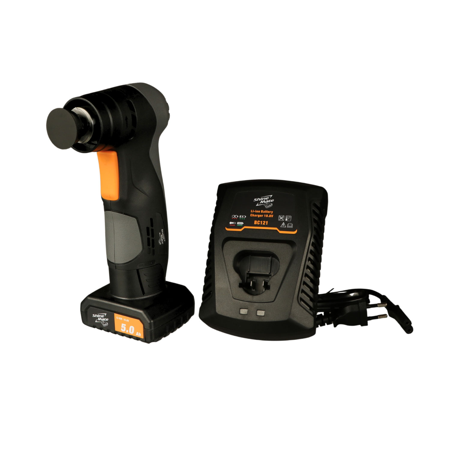 Im Set enthalten ist der ShineMate 10,8 V Akku mit 5,0 Ah, der im Vergleich zur 2,5 Ah Variante eine deutlich längere Laufzeit bietet. Das BC121 Ladegerät lädt den Akku zuverlässig wieder auf und sorgt für kurze Ladezeiten im Arbeitsalltag. Durch die kompakte Bauweise und das geringe Gewicht liegt der Blütenschleifer sehr gut in der Hand und eignet sich besonders für Spot-Repair, Smart-Repair, Lackvorbereitung und Arbeiten in engen Bereichen.